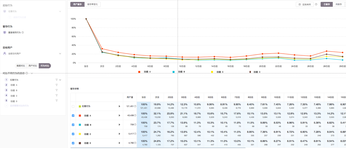 | 对比不同行为的回访 | 起始和留存行为相同,对比用户重复不同行为的情况 | 常用来对比不同的产品功能的用户黏度;理想的功能表现是用户覆盖量较大且留存率高 |