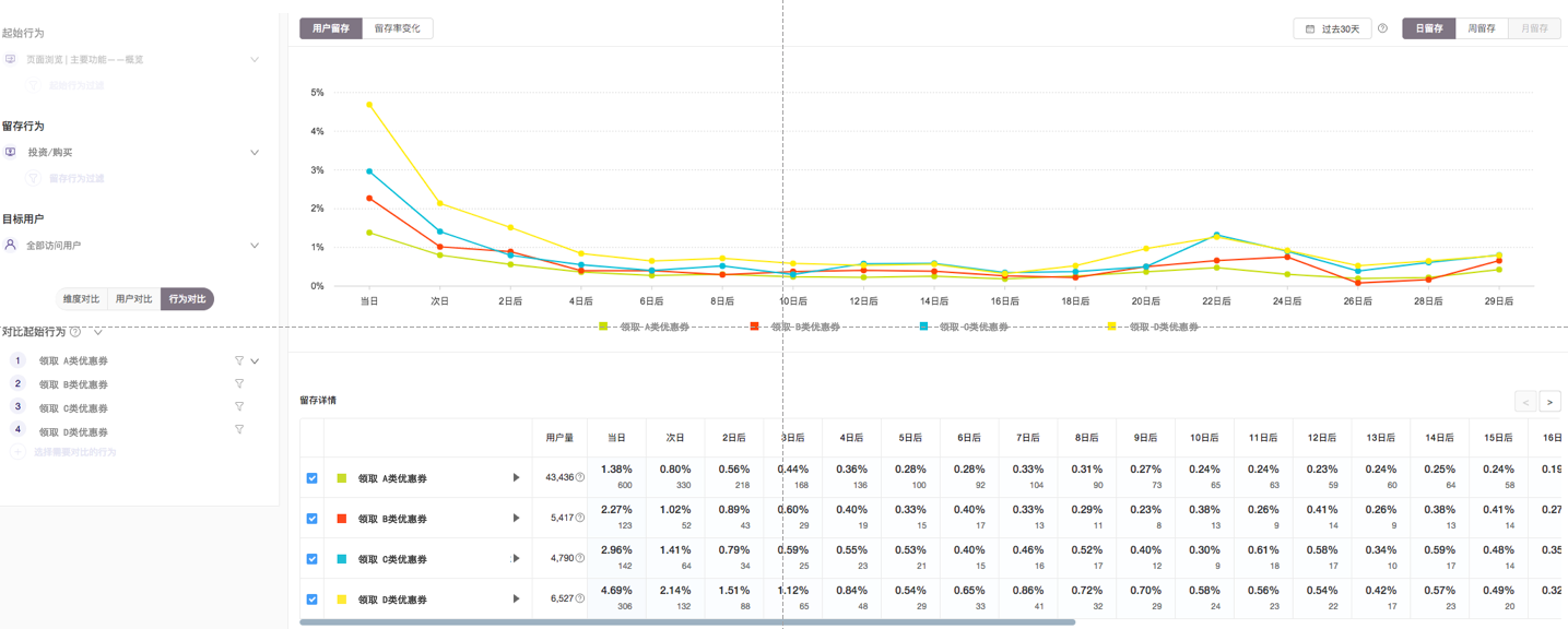 通过留存曲线可以看到,不同优惠券领取的用户量和后后续对刺激用户后续投资/购买的差异。